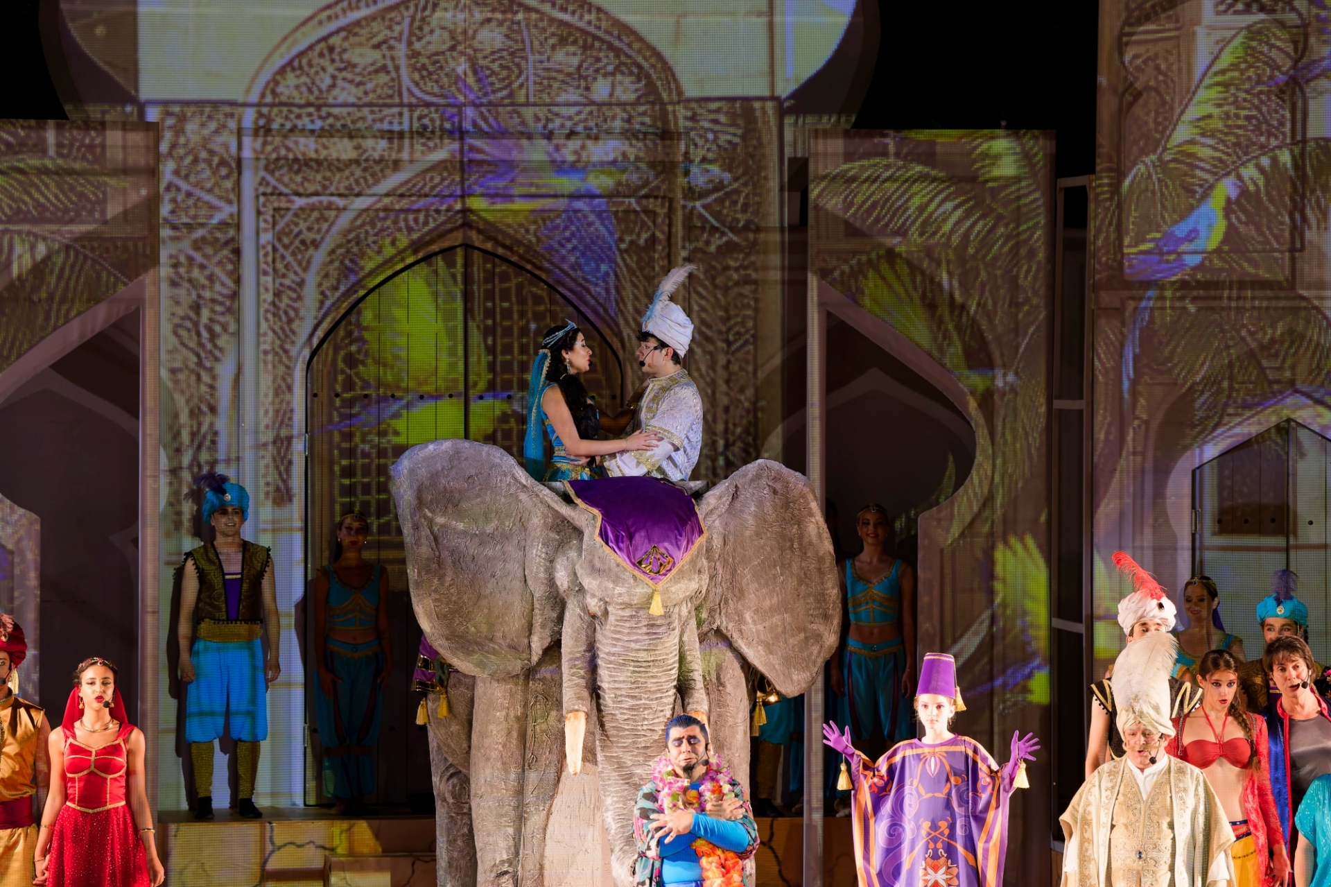 Репликите звучат на български език, а песните се изпълняват в оригинал на английски със субтитри, запазвайки характерното звучене на музиката на Алън Менкен. "A Whole New World", "Friend Like Me" и "Prince Ali" се открояват като ключови музикални акценти в спектакъла.