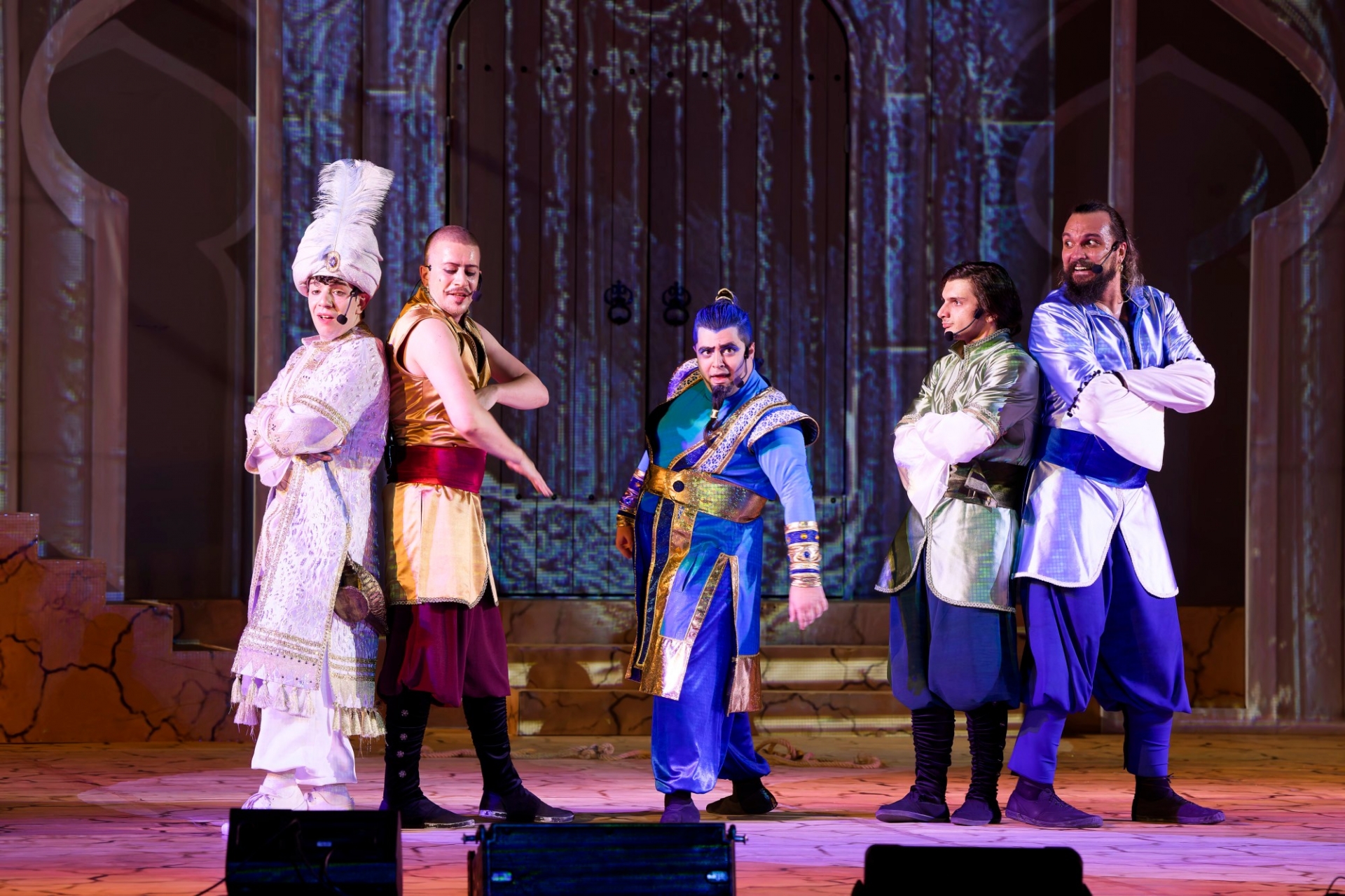 Особено ярко присъствие има Джинът в изпълнение на Даниел Добрев – персонажът, който задава темпото на представлението и създава пряка връзка с публиката чрез хумор и сценична енергия. В главните роли са Георги Георгиев като Аладин и Кристияна Атанасова като принцеса Жасмин, заедно с Тихомир Трифонов в ролята на Джафар, Боян Стоянов като Яго и Красимир Добрев като Султана.