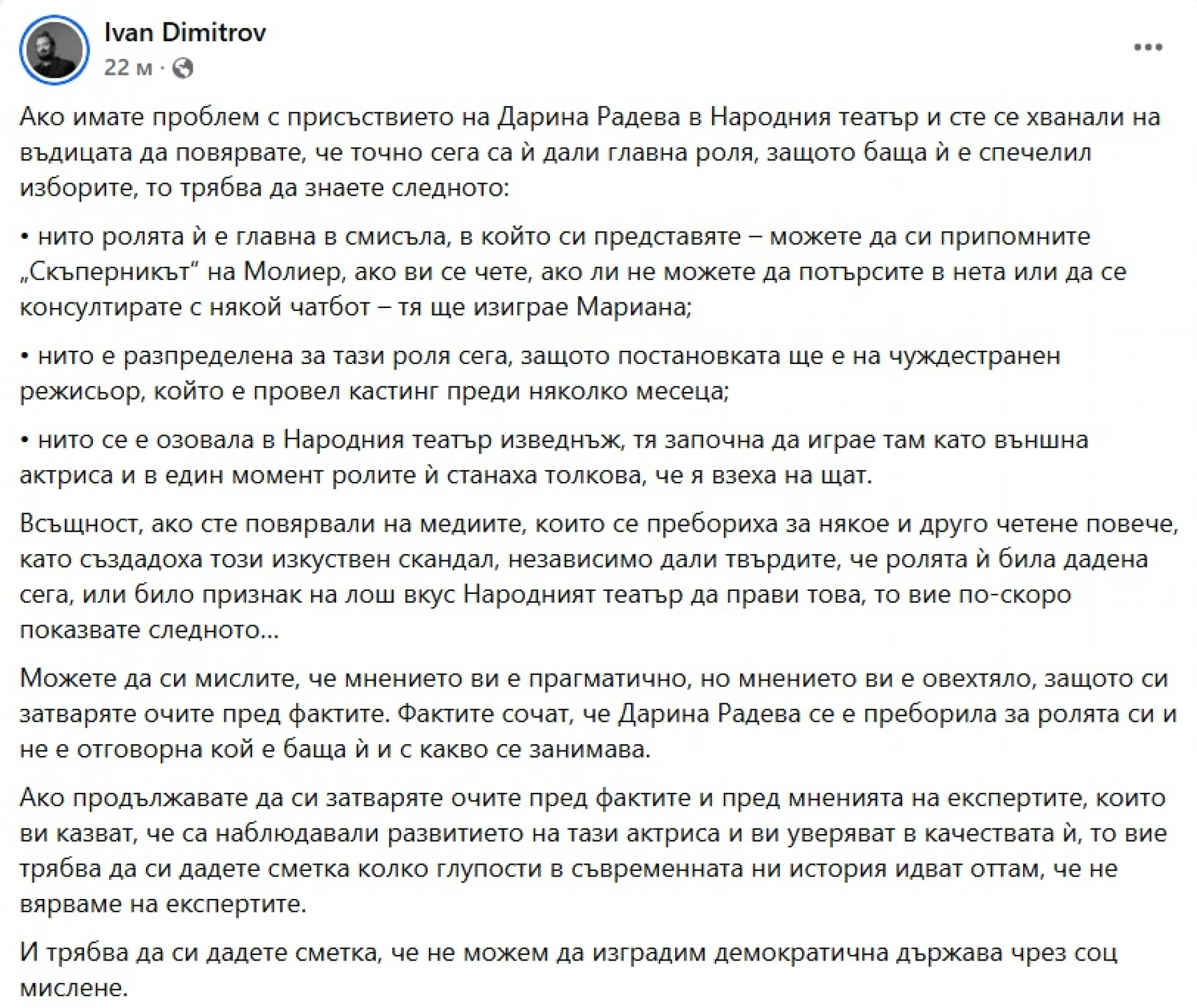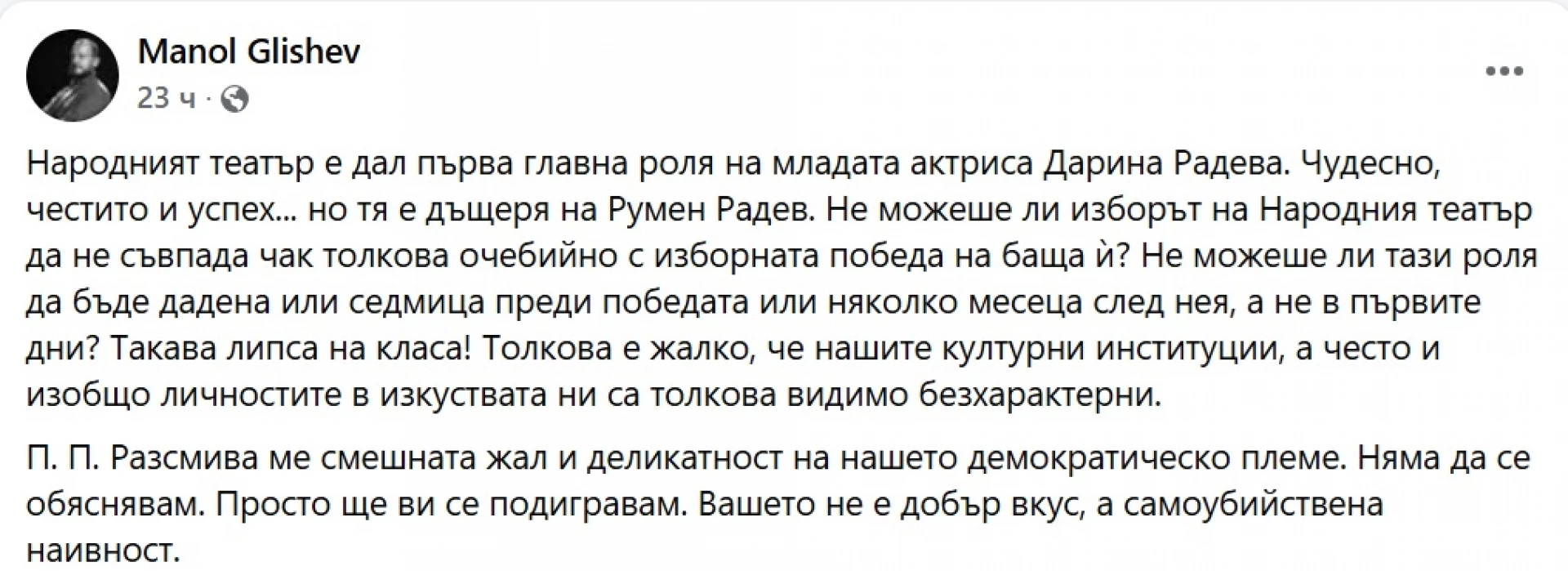 "Народният театър е дал първа главна роля на младата актриса Дарина Радева. Чудесно, честито и успех... но тя е дъщеря на Румен Радев. Не можеше ли изборът на Народния театър да не съвпада чак толкова очебийно с изборната победа на баща ѝ? Не можеше ли тази роля да бъде дадена или седмица преди победата или няколко месеца след нея, а не в първите дни? Такава липса на класа! Толкова е жалко, че нашите културни институции, а често и изобщо личностите в изкуствата ни са толкова видимо безхарактерни. П. П. Разсмива ме смешната жал и деликатност на нашето демократическо племе. Няма да се обяснявам. Просто ще ви се подигравам. Вашето не е добър вкус, а самоубийствена наивност.", написа в своя Facebook профил Манол Глишев и постът му получи над хиляда харесвания.