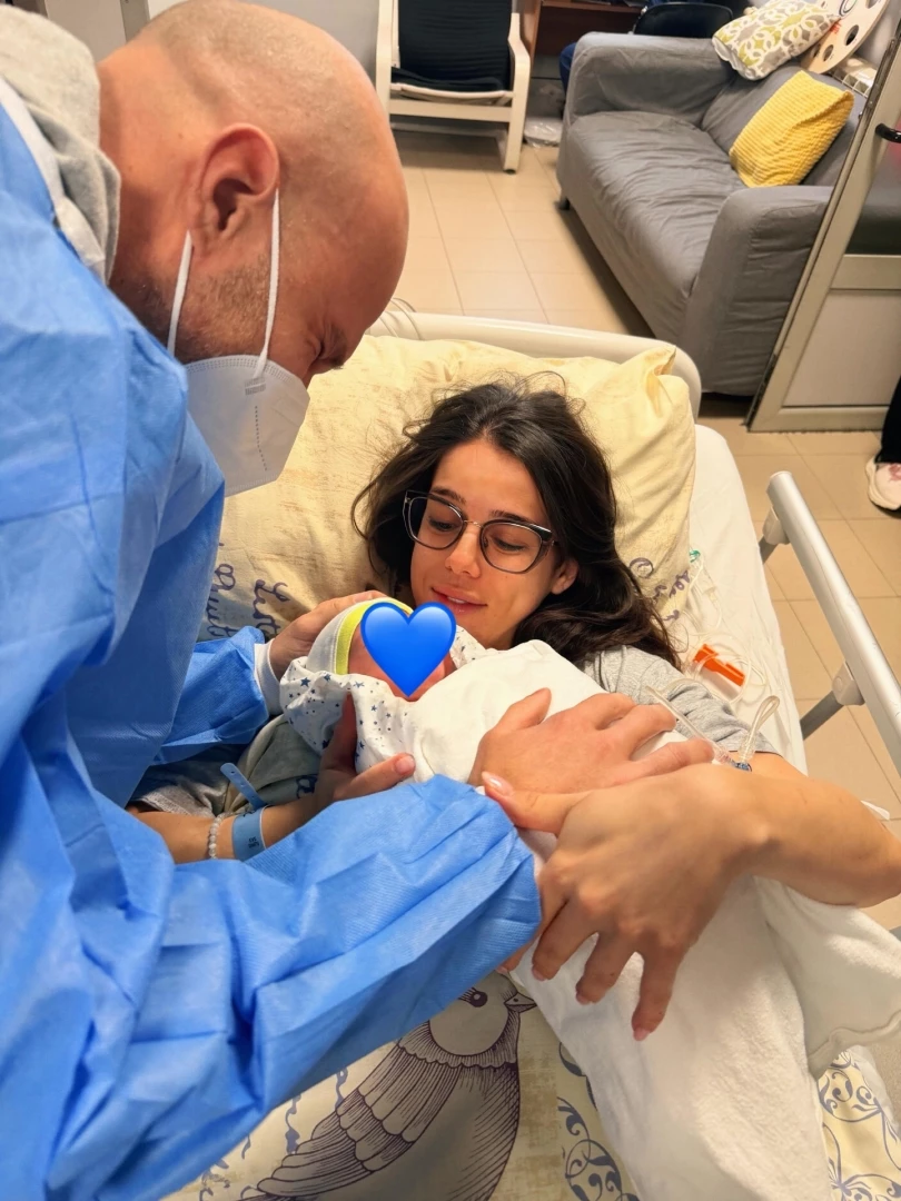 Бащата Антон също присъства на кадъра, за да сподели специалния момент с майката на детето си.
