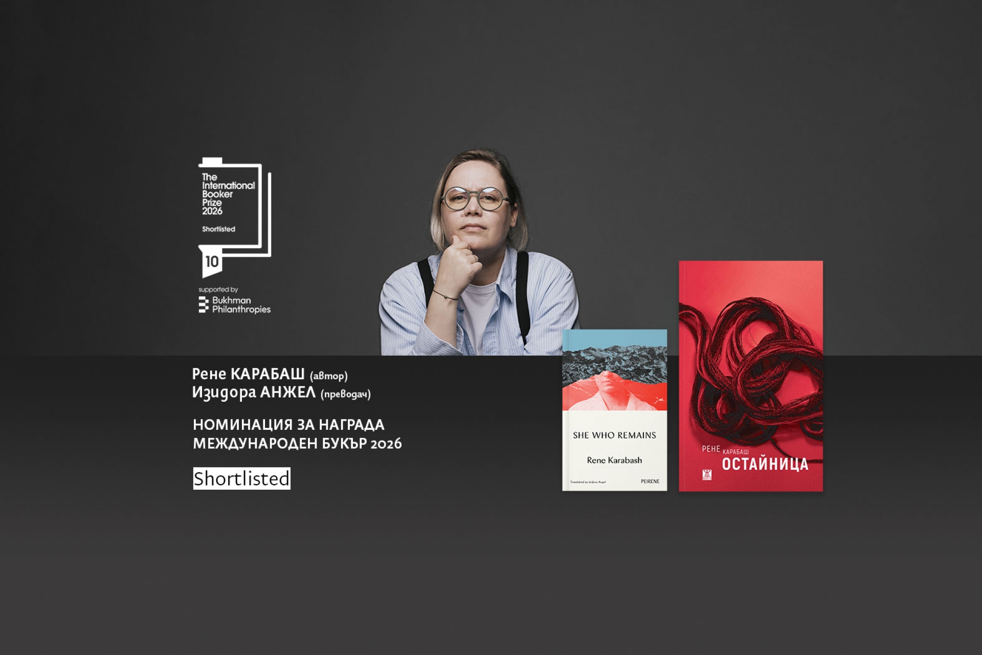 Припомняме, че романът на Рене Карабаш "Остайница", в превод на английски на Изидора Анжел, влезе в краткия списък за Международната награда "Букър". Това е вторият български роман, попаднал в списъка с номинираните, след "Времеубежище" на Георги Господинов в превод на Анджела Родел, който спечели наградата през 2023 година.