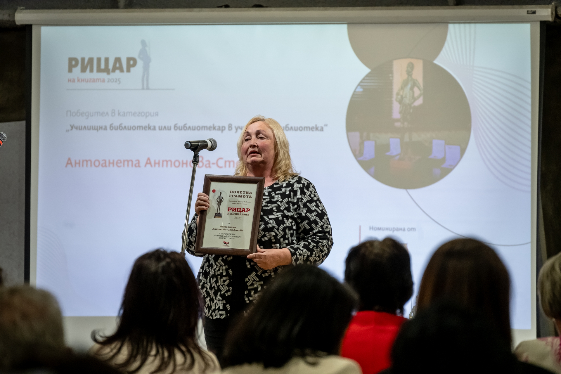 В тегория „Училищна библиотека или библиотекар“, която тази година за първи път заема своето заслужено, самостоятелно място, наградата получи училищният библиотекар Антоанета Антонова-Стефанова, която с усмивка сподели, че училищната библиотека е единственото място, където учениците със съжаление чуват звънеца.