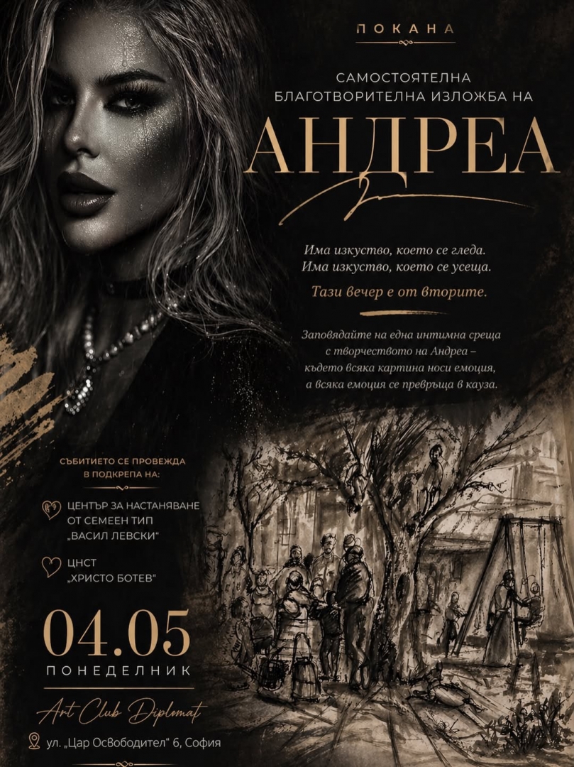 Изпълнителката Андреа ще открие самостоятелна благотворителна изложба на 4 май в Art Club Diplomat в София. Събитието съчетава представяне на визуално изкуство с кауза, като средствата от изложбата ще бъдат дарени в подкрепа на Център за настаняване от семеен тип "Васил Левски" и Център за настаняване от семеен тип "Христо Ботев" в София. Даренията са предназначени за деца с увреждания, настанени в двата центъра.
