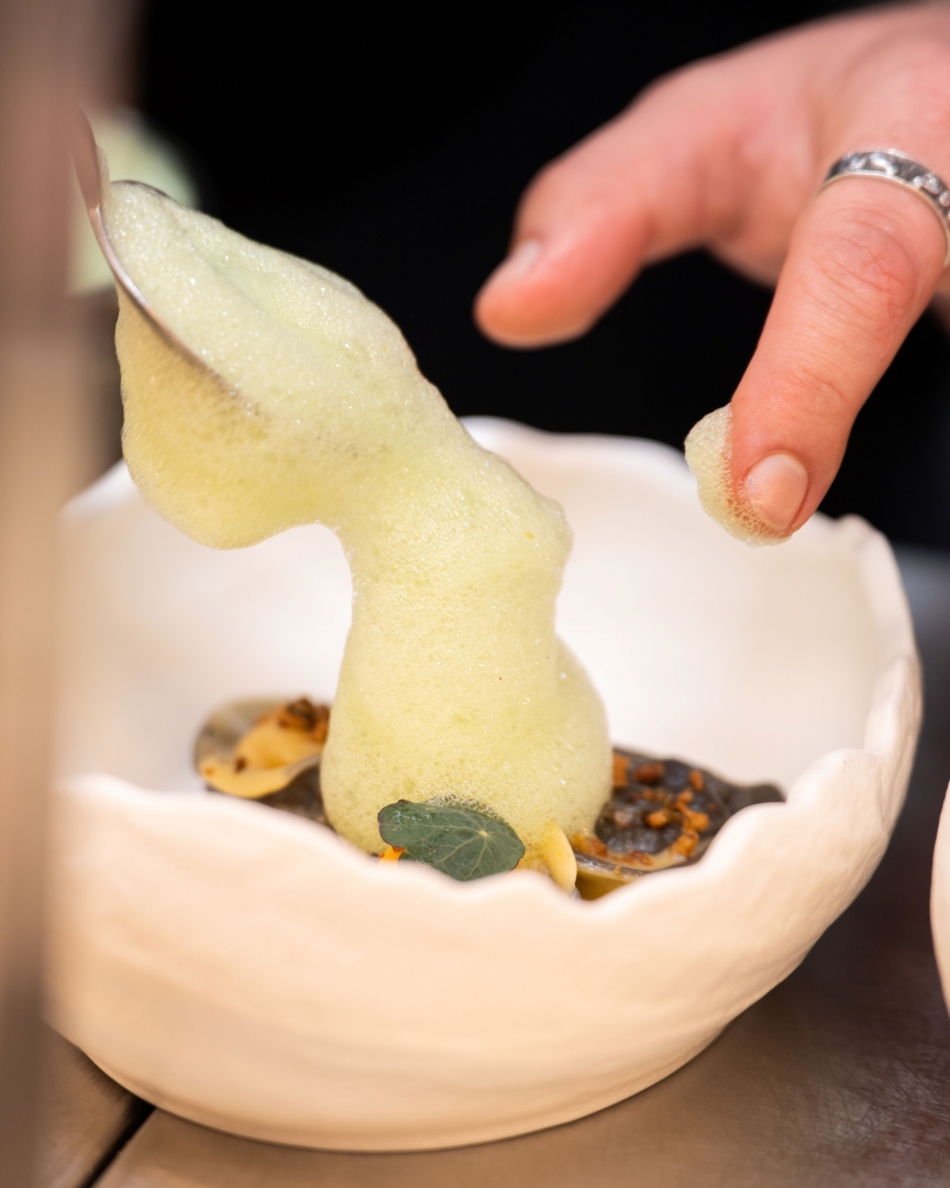 В центъра на това преживяване бяха двама мъже, които говорят един и същ език, този на съвършения детайл. Джордж Калайтсидис донесе със себе си спокойствието на остров Крит и опита си от големите европейски кухни (школата на Ален Дюкас и британските Hambleton Hall и Alchemilla). Срещу него застана домакинът Валентин Димитров, чийто професионален път също е белязан от високите изисквания на „Мишлен“ стандартите.